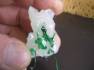 Nach dem Erstarren das Bärchen aus der Form holen (spitzer Gegenstand hilfsreich) eine Dreierkette binden: LANG( einer LED) mit KURZ (anderer LED) zusammen zwirbeln (zwei Zöpfe), eine KURZ (links) und eine LANG(rechts) vorsichtig (Beinbruchgefahr) zu Ösen drehen (Ösen sollten in Abstand von